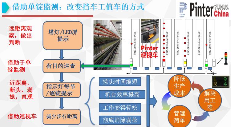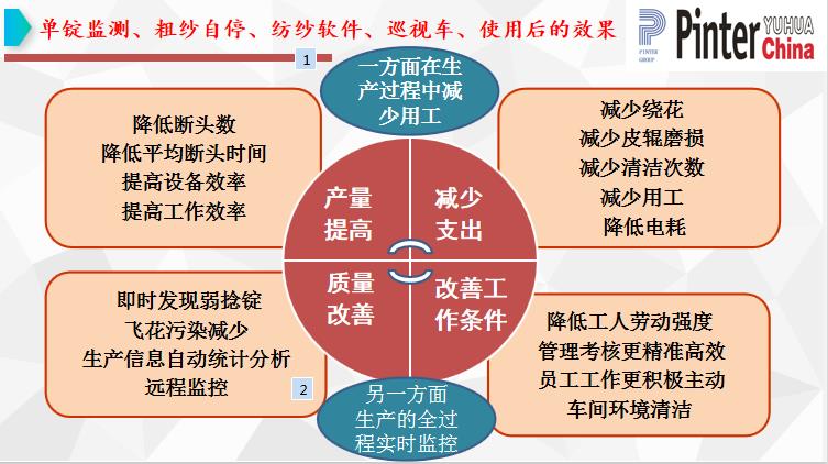 工作環(huán)境和勞動強度的改變:使工作變的輕松,提高工人積極性,改變招工難的現(xiàn)狀。飛花減少,一方面有利于紗線質(zhì)量,另一個方面減少污染,環(huán)境得以改善,飛花減少,減少清潔次數(shù),增加車間的潔凈度。減少擋車工及保全工,降低用工成本。