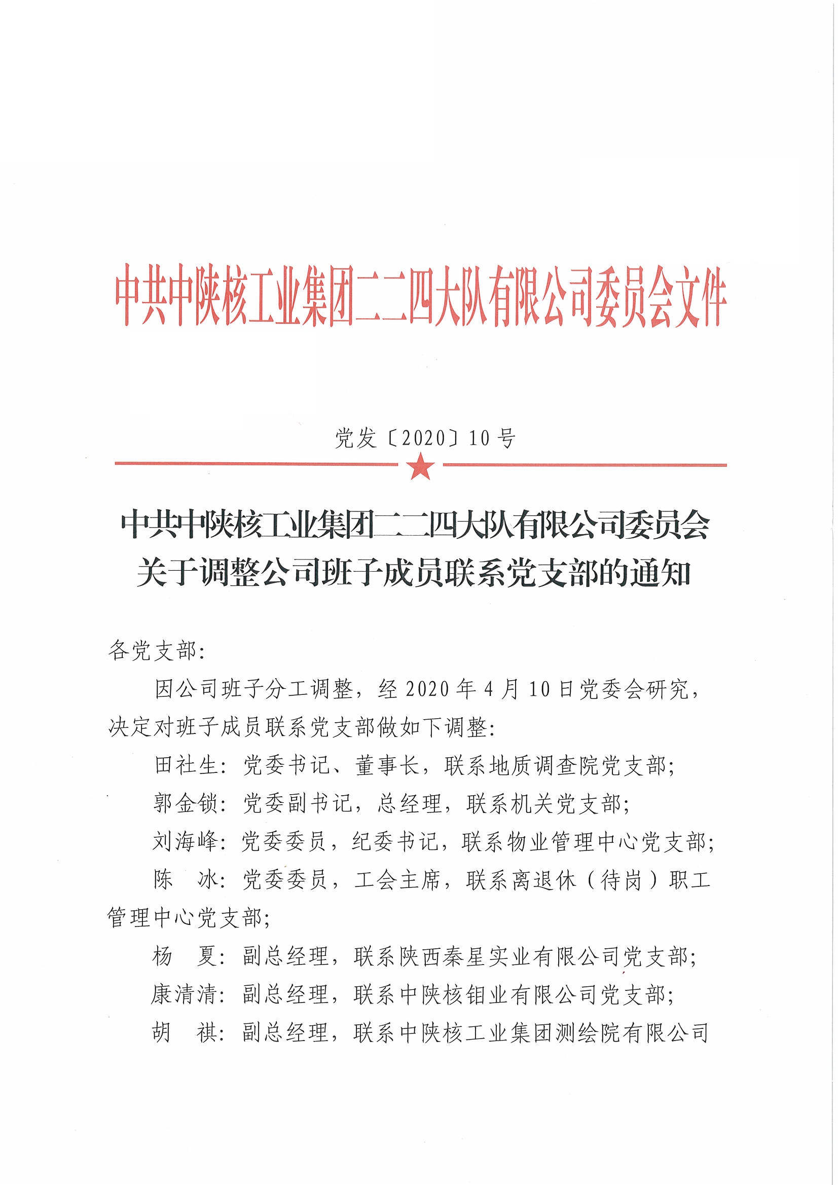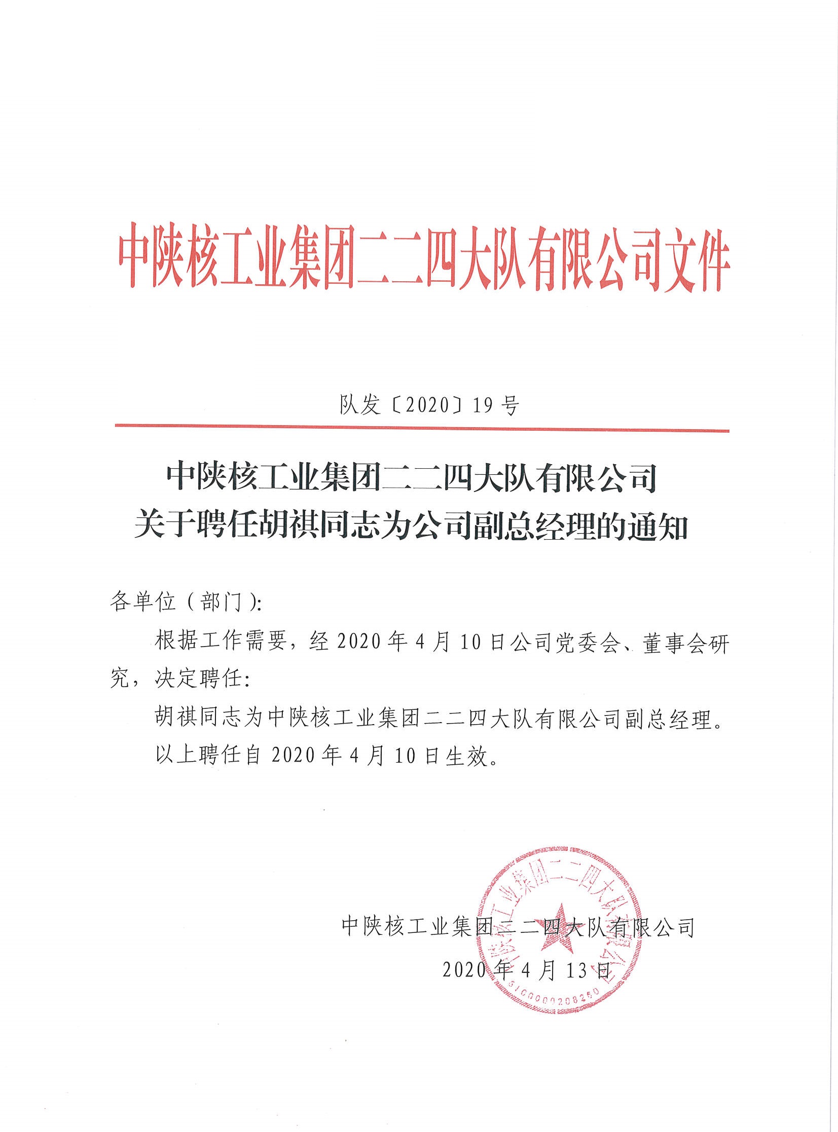 企業(yè)動態(tài)根據(jù)工作需要,經(jīng)2020年4月10日大隊黨委會、董事會研究,決定聘任:胡祺同志為中陜核工業(yè)集團(tuán)二二四大隊有限公司副總經(jīng)理。