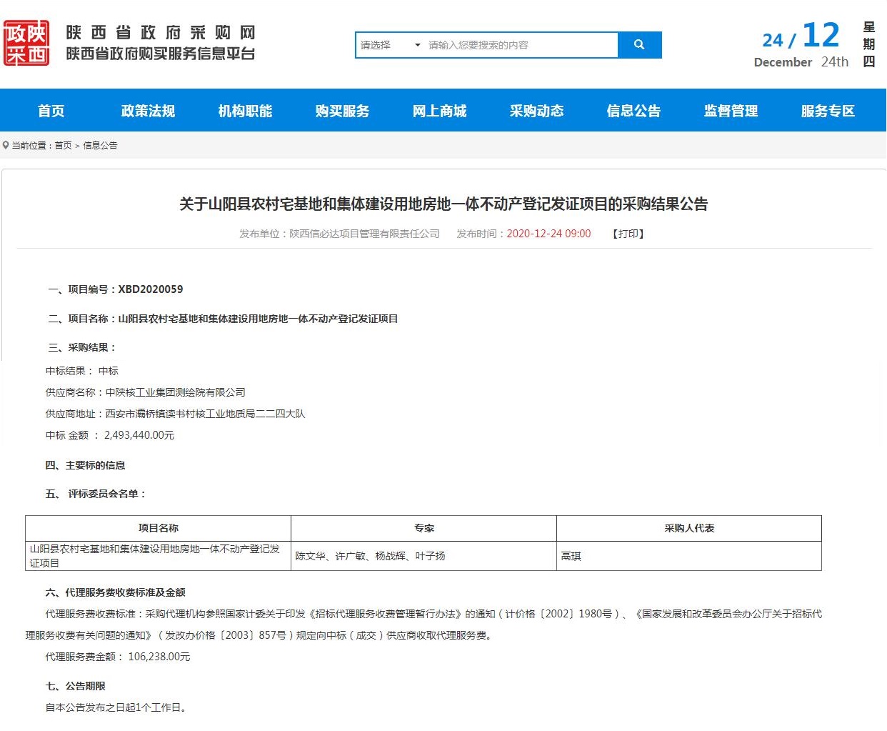 近日從陜西省政府采購網(wǎng)獲悉,二二四大隊(duì)測繪院在山陽縣農(nóng)村宅基地和集體建設(shè)用地房地一體不動(dòng)產(chǎn)登記發(fā)證項(xiàng)目招標(biāo)中拔得頭籌,成功中標(biāo)該項(xiàng)目,中標(biāo)價(jià)249萬余元。