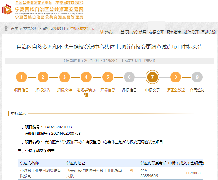業(yè)績(jī)展示近日從寧夏回族自治區(qū)公共交資源交易網(wǎng)獲悉,中陜核測(cè)繪院以112萬(wàn)元的價(jià)格中標(biāo)自治區(qū)自然資源和不動(dòng)產(chǎn)確權(quán)登記中心集體土地所有權(quán)變更調(diào)查試點(diǎn)項(xiàng)目(一標(biāo)段)。
