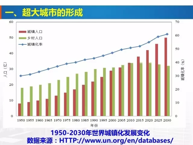 城鎮(zhèn)化是當(dāng)今世界上社會(huì)和經(jīng)濟(jì)方面最主要的一個(gè)活動(dòng)。21世紀(jì),全球人口的半數(shù)以上要生活在城市地區(qū),而且這個(gè)趨勢(shì)是不斷地在加快。每年超過(guò)6000萬(wàn)人會(huì)涌入城市,平均每一周會(huì)有100萬(wàn)人。而聯(lián)合國(guó)統(tǒng)計(jì),全世界358個(gè)百萬(wàn)以上人口城市中的153個(gè)在亞洲。在27個(gè)人口超過(guò)千萬(wàn)級(jí)的“超級(jí)城市super city”,其中有15個(gè)會(huì)出現(xiàn)在亞洲。這就是我們城鎮(zhèn)化的速度。