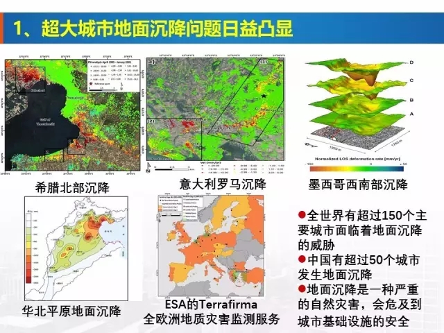 第一個(gè),超大城市地面會(huì)沉降。這是國(guó)外若干個(gè)城市,從希臘、羅馬、墨西哥,還有我們?nèi)A北平原的地面沉降情況,歐空局調(diào)查出來(lái)的數(shù)據(jù)。