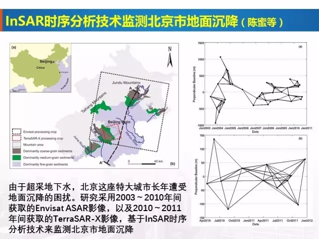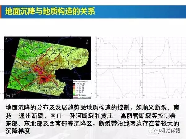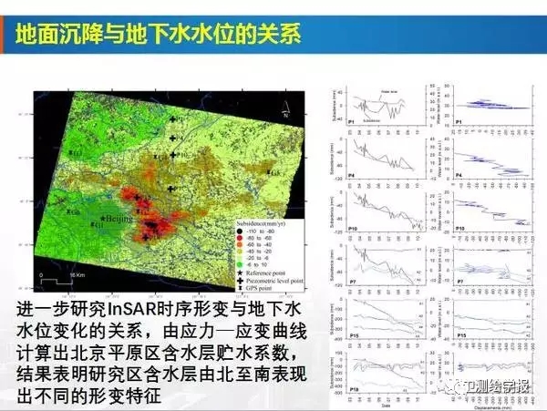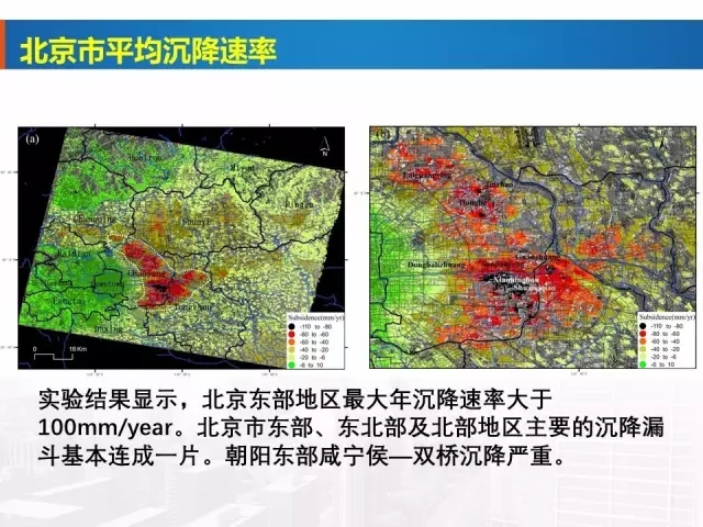 上圖是我們運(yùn)用雷達(dá)遙感技術(shù)研究的北京地區(qū)地面下沉的情況。大家可以看這個(gè)紅的地區(qū),是一個(gè)漏斗狀的,它的年下沉速度達(dá)到了100mm/年,是在北京市東部、東北部交叉。朝陽(yáng)東部咸寧侯到雙橋一帶,沉降嚴(yán)重,靠近通州,因?yàn)橥ㄖ莠F(xiàn)在是一個(gè)副城市中心。我們用GPS、北斗驗(yàn)證了剛才這個(gè)結(jié)論是正確的。