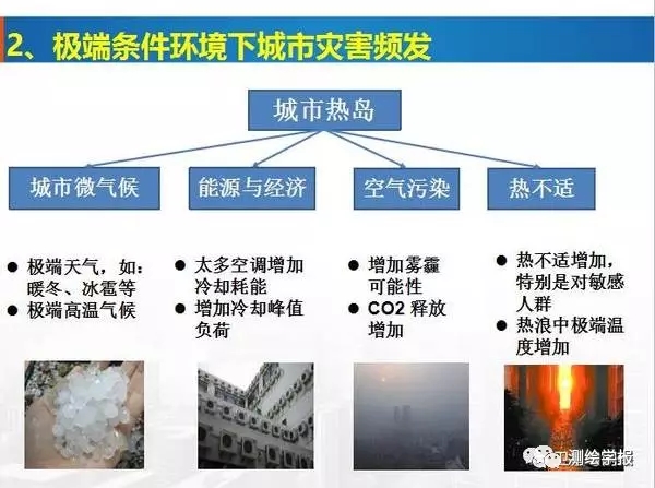 那么,第二個(gè)問(wèn)題是城市的環(huán)境問(wèn)題,我們稱之為城市熱島,包括城市微氣候、城市的能源和經(jīng)濟(jì)、城市的空氣污染PM2.5、霧霾、碳排放還有熱不適。