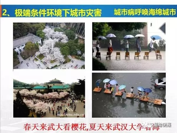 那么就出現(xiàn)了東邊日出、西邊雨。我們就會(huì)發(fā)現(xiàn)北京遇到的風(fēng)雨雹的異常天氣的出現(xiàn);那么武漢就會(huì)出現(xiàn)一個(gè)晚上500mm的降水就把整個(gè)城市給淹了,人們戲稱,“春天到武大看櫻花,夏天來(lái)武大看?!?。2012年北京有暴雨,2011年武漢市有內(nèi)澇,2013年光昆明的雨災(zāi)損失就達(dá)到一億元以上。
