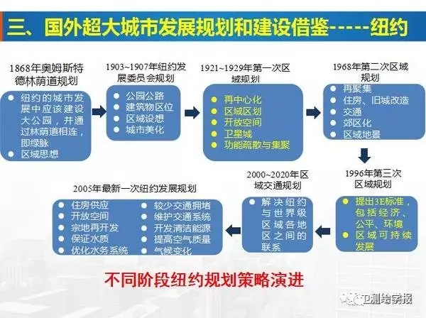 首先看看紐約,紐約做了多次的規(guī)劃,它的趨向是從城市規(guī)劃走向區(qū)域規(guī)劃,搞衛(wèi)星城,搞一個(gè)很大區(qū)域的可持續(xù)發(fā)展的城市,而不是簡(jiǎn)單地“攤大餅”。這些衛(wèi)星圖顯示的是它發(fā)展的一個(gè)過(guò)程,整個(gè)大區(qū)域整體均衡的發(fā)展起來(lái)。